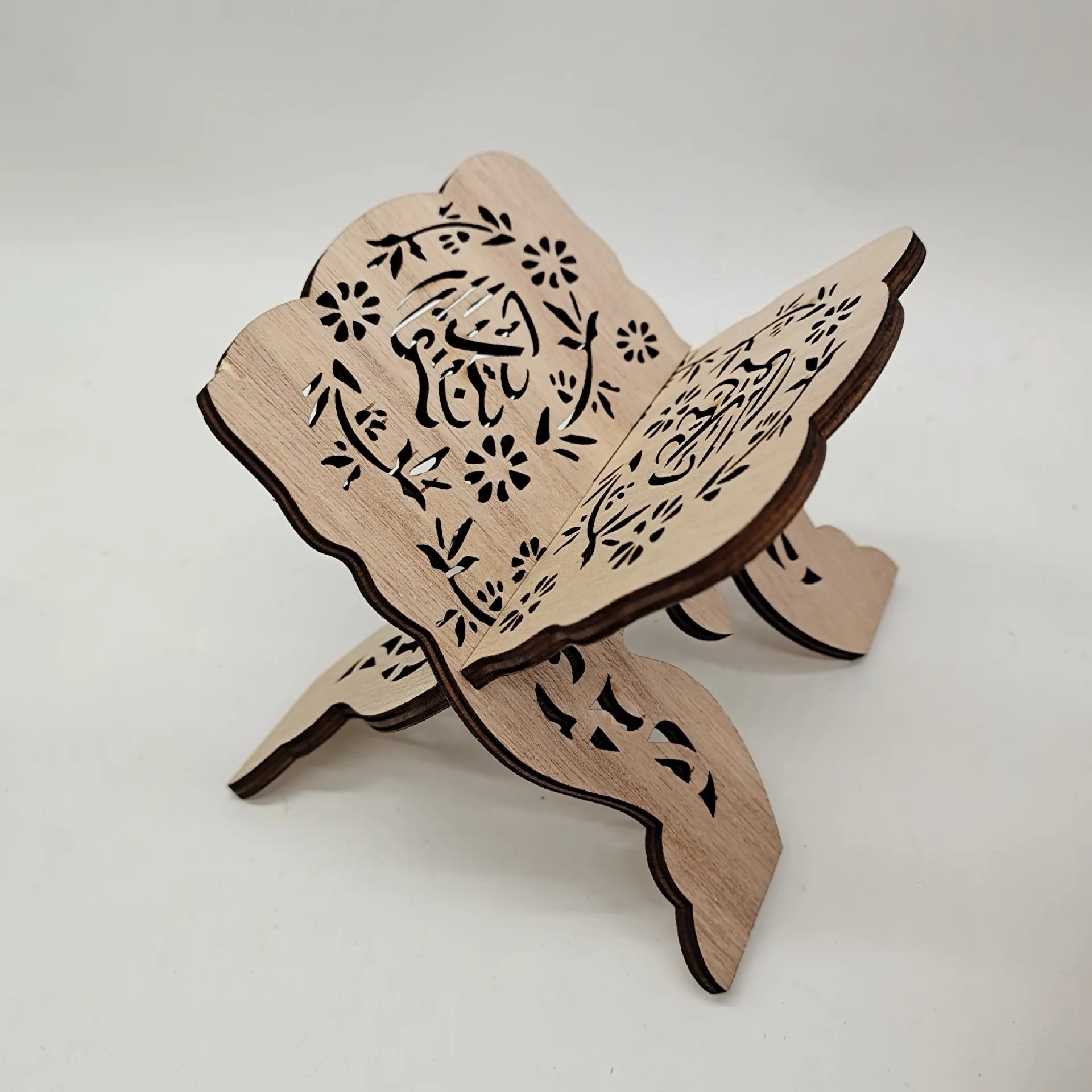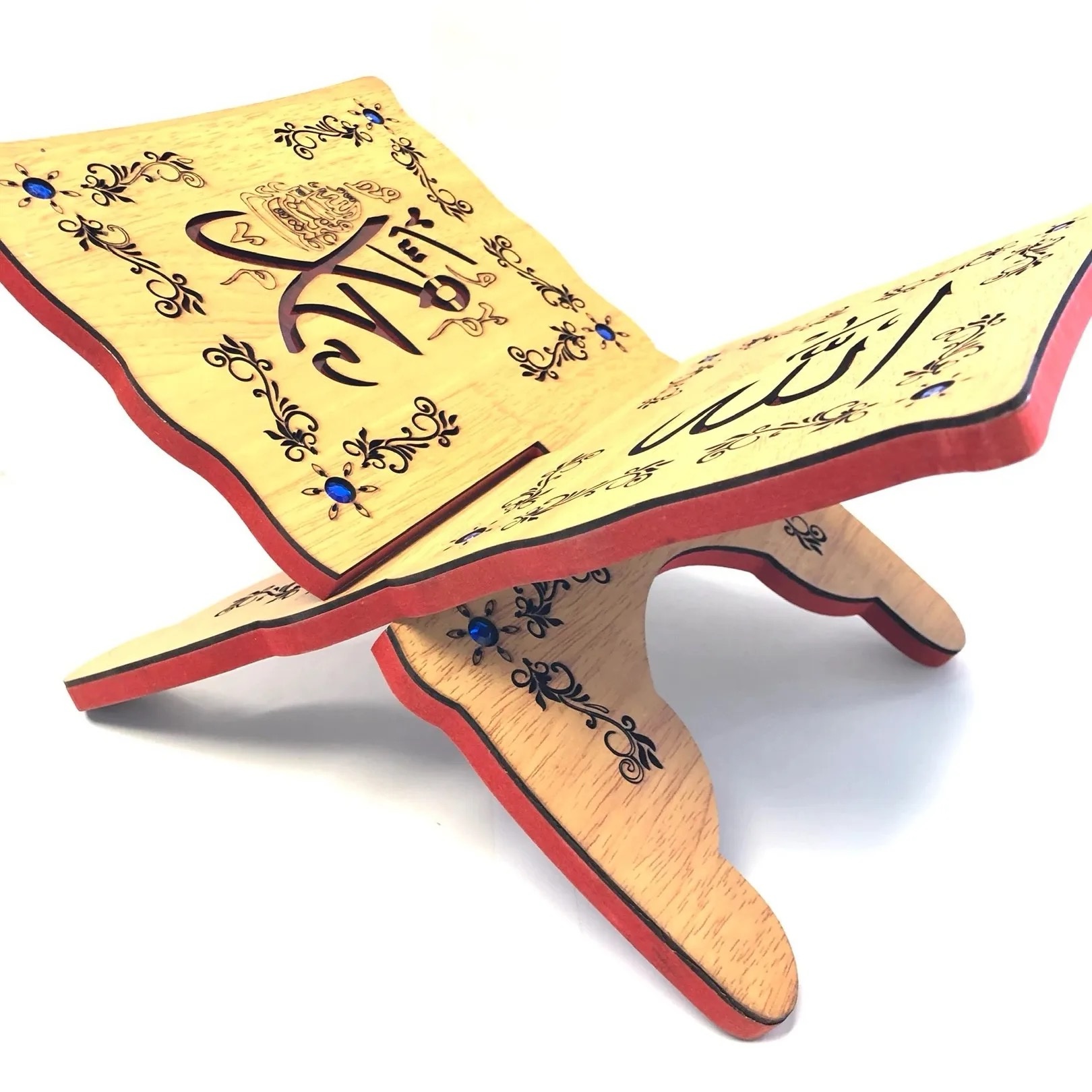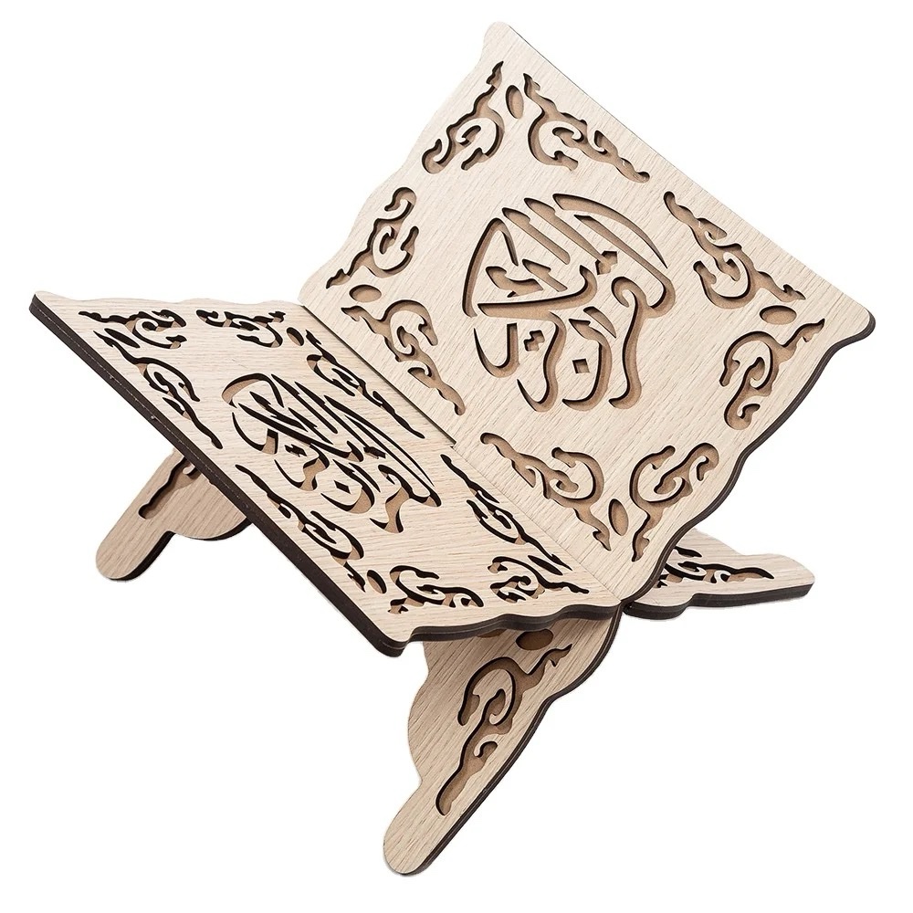 Joli porte Coran fabriqué en mode artisanal la matière est en bois, et magnifiquement sculpté d’arabesque avec la calligraphie arabe “Allah et Muhammad” SAW .